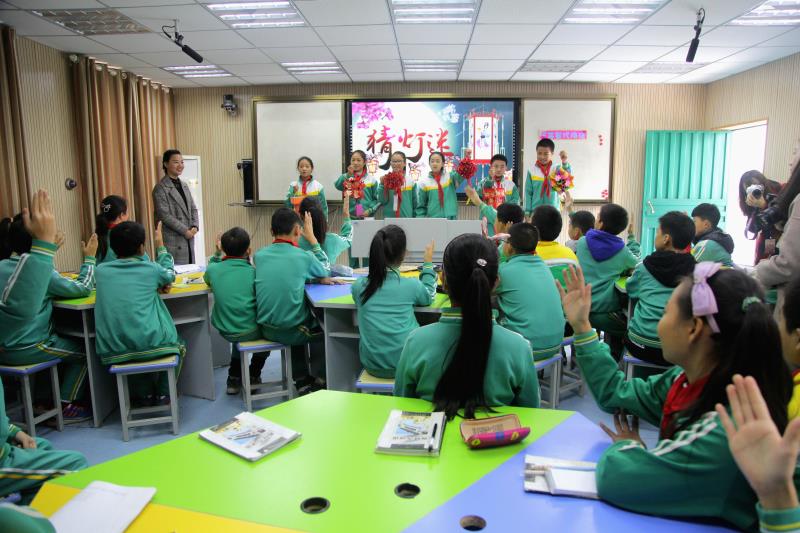 陪同考察调研的宜都市文体新广旅游局局长陈微向来宾致欢迎词,高坝洲镇中心小学校长周金华对“谜语进课堂”情况从课程安排、教学方式等方面进行了汇报,与学员们进行了探讨和交流。在高坝洲镇中心小学,研修班学员和小学生们一同听了中心小学李杨老师的谜语课。课堂上相互猜谜、制谜,现场气氛十分活跃。