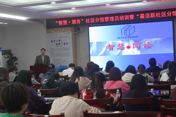 4月22日上午 “智慧•服务”社区分馆管理员技能培训暨“最活跃社区分馆”颁奖活动在图书馆五楼多媒体会议室举行。本次活动以“智慧•服务”为主题,以提高总分馆服务水平和效能为重点,推动分馆和馆外流通点开展丰富多彩的阅读活动,让全民阅读工作在社区落地生根、开花结果。宜昌市图书馆社区分馆管理员、馆外流通点管理员及部分社区网格员等近60余人前来参会。