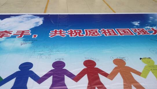 106名贫困生与市图书馆面向社会招募的三十个家庭欢聚一堂,两两结对,在以庆祝建国七十周年“手牵手,共祝愿祖国强大”为主题的画布上,留下涂鸦纪念,并互留联系方式,拍照留影,建立友谊桥梁。