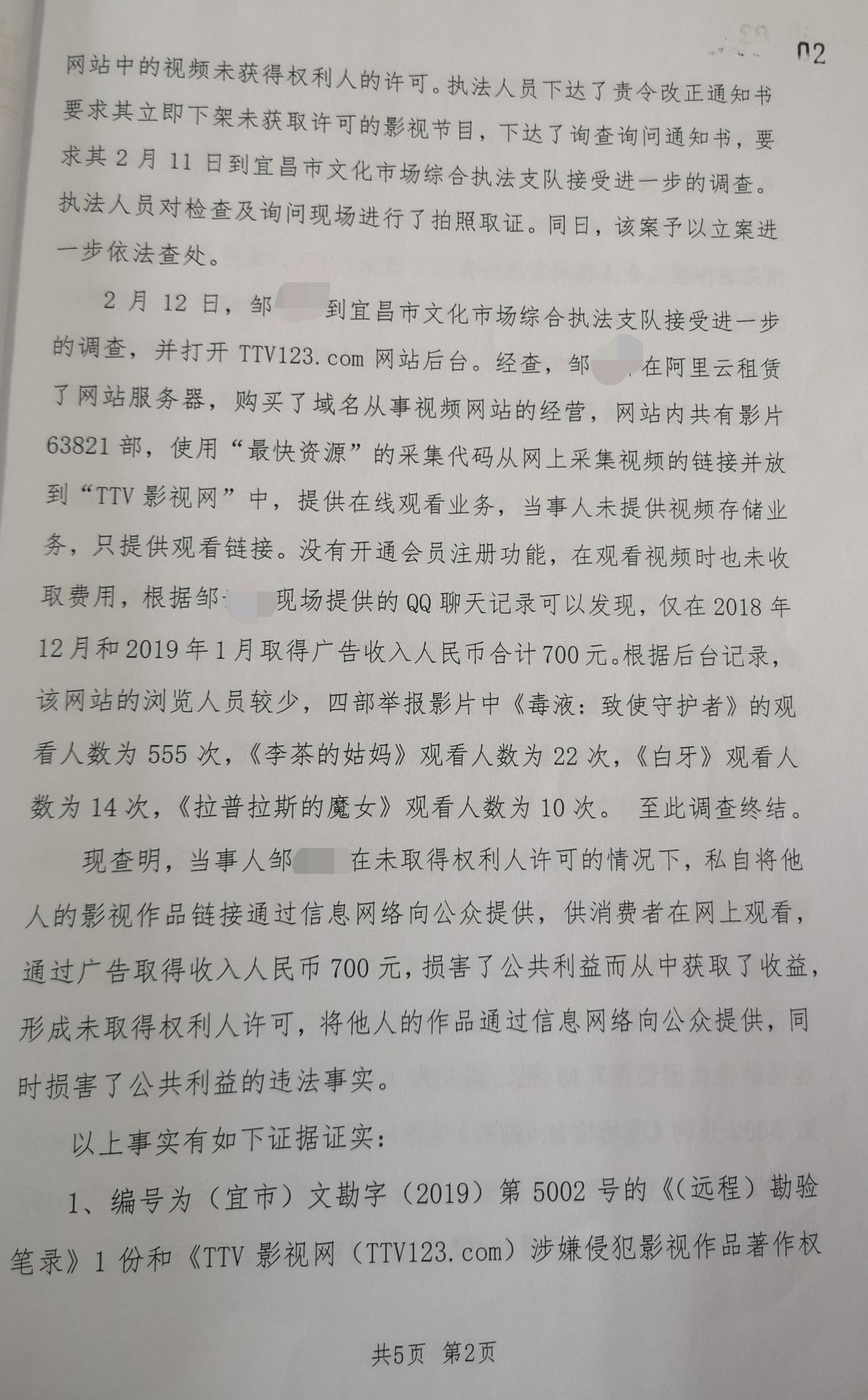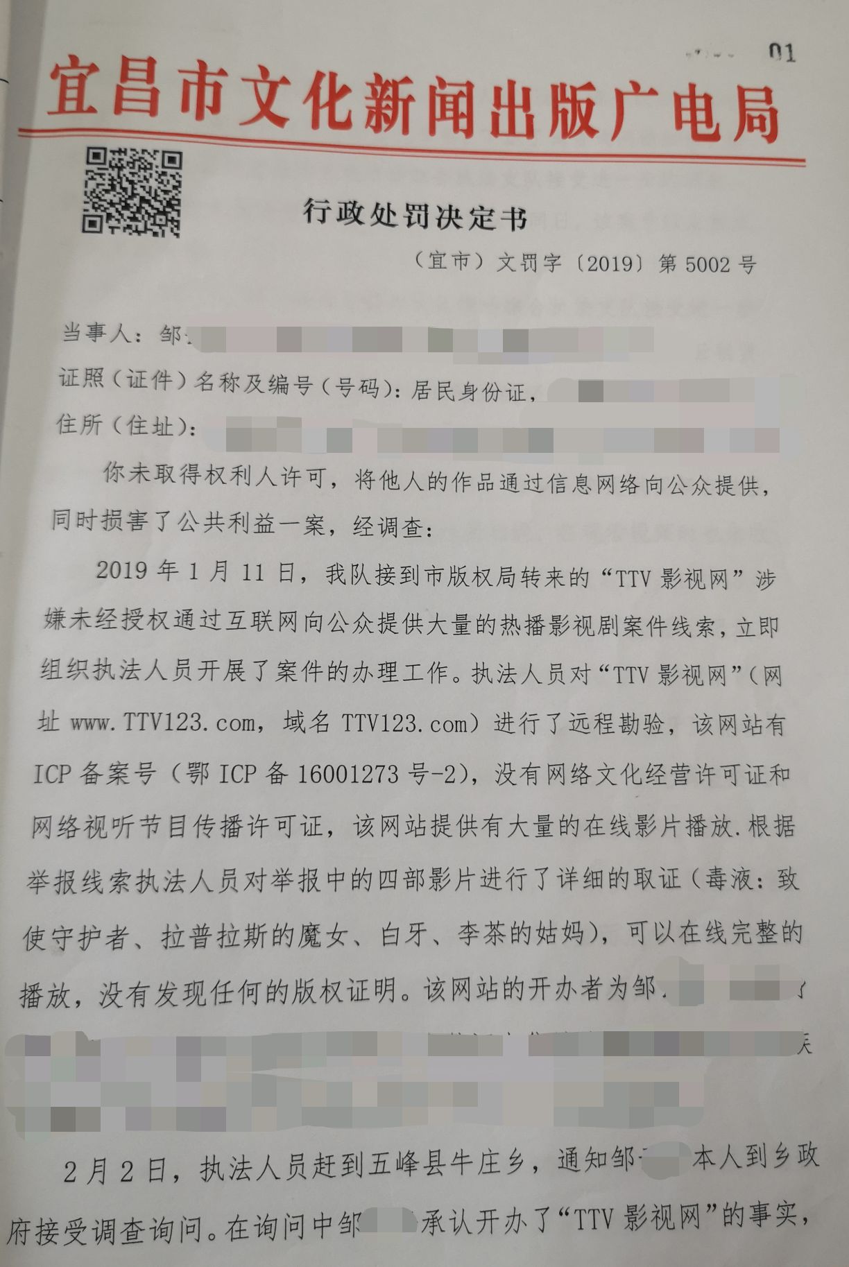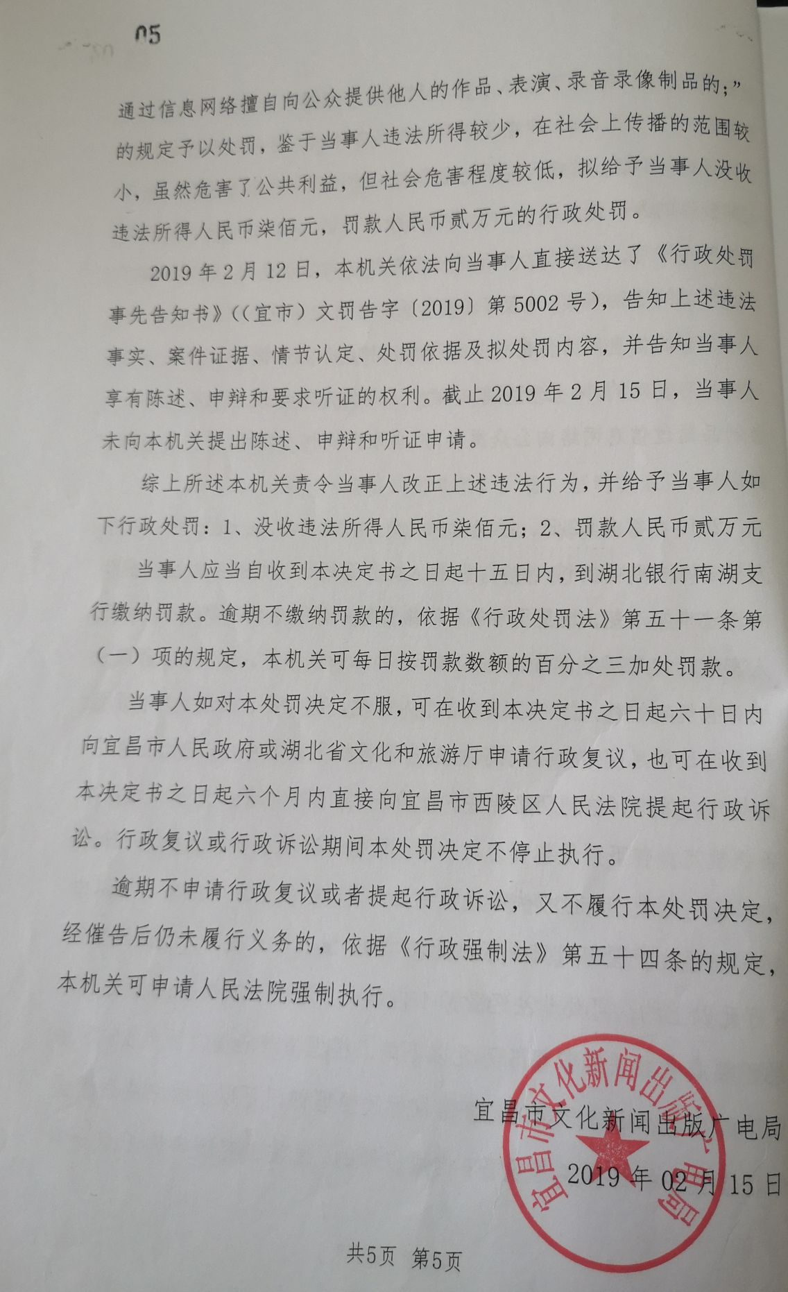 宜昌市文化和旅游局行政处罚决定书(宜市)文罚字〔2019〕第5002号