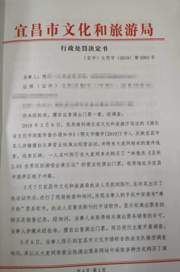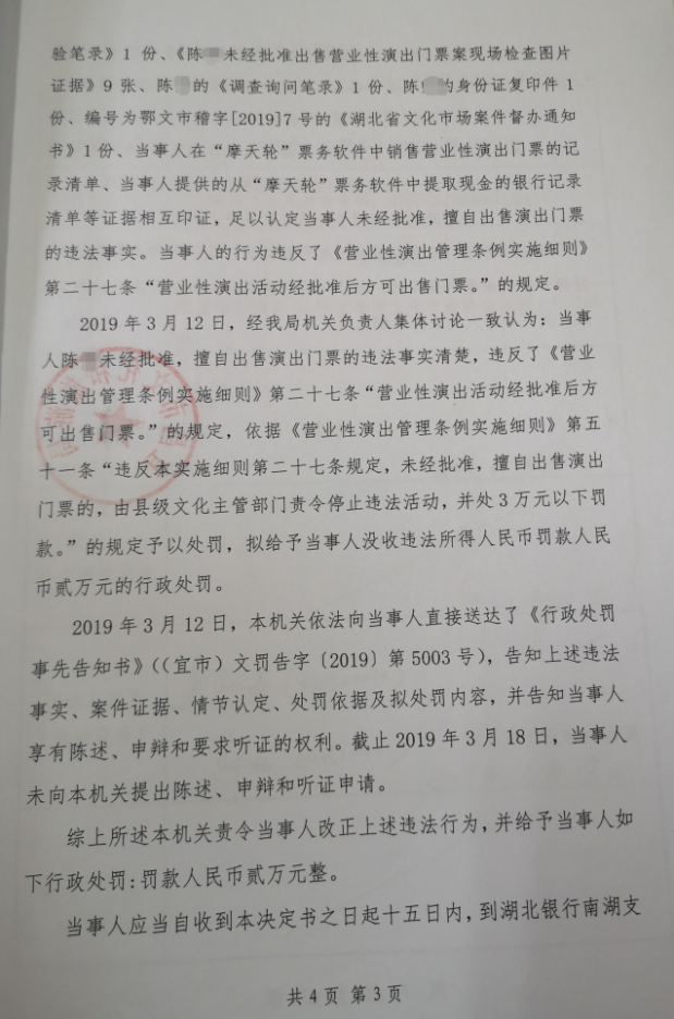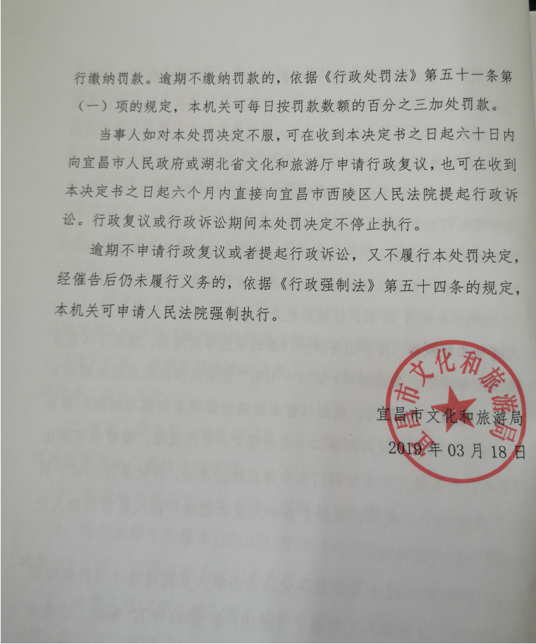 宜昌市文化和旅游局行政处罚决定书(宜市)文罚字〔2019〕第5003号