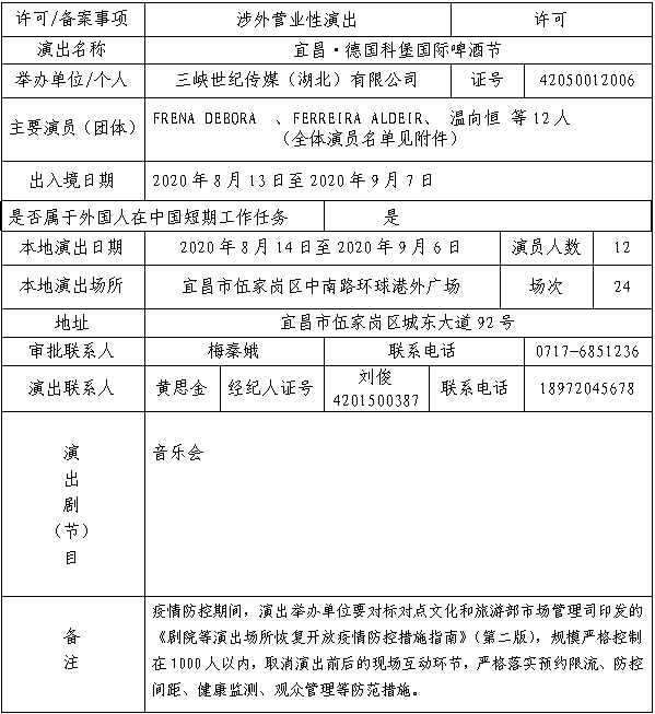 宜昌市营业性演出准予许可决定(宜文演 〔2020〕1号)