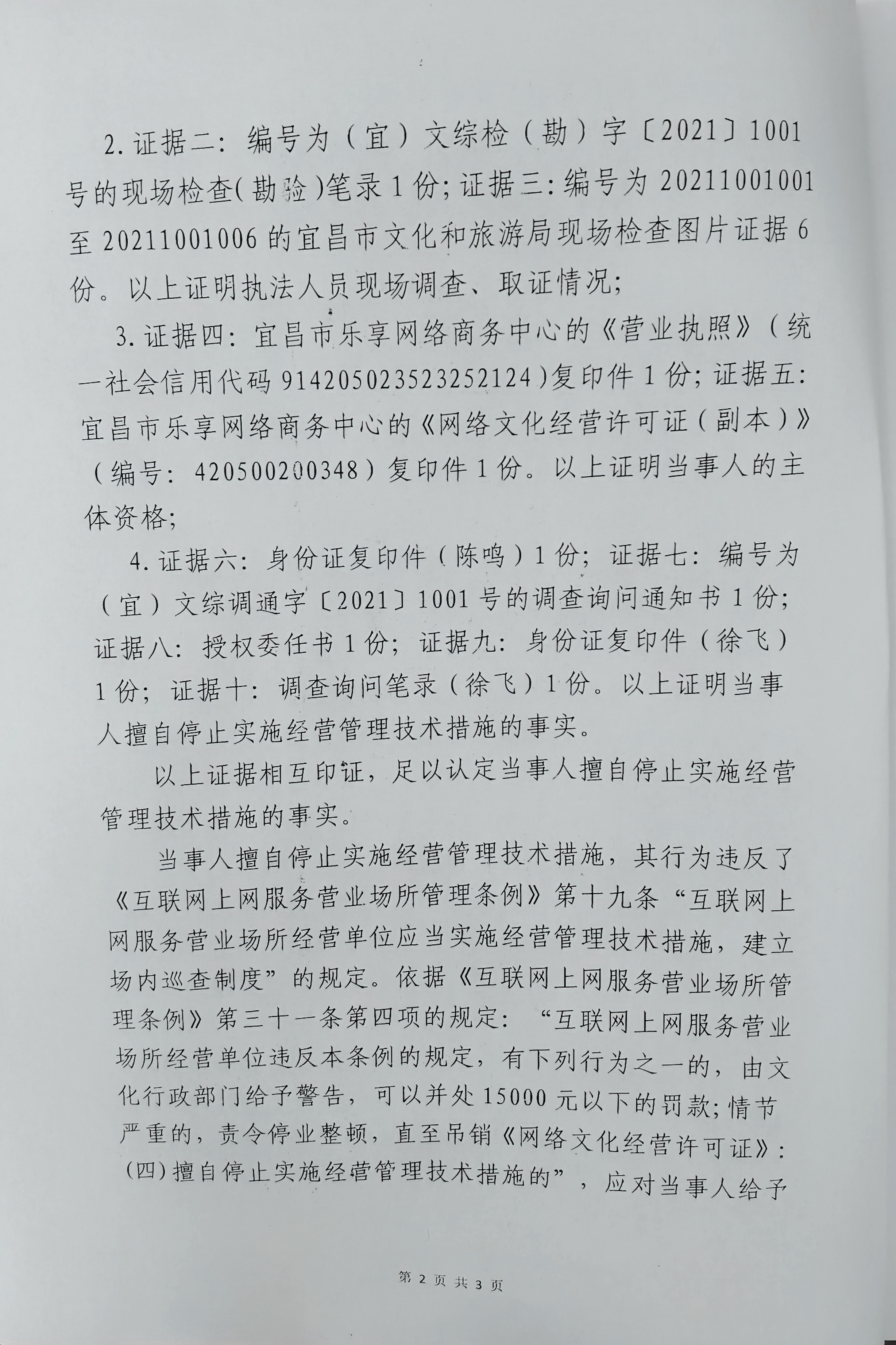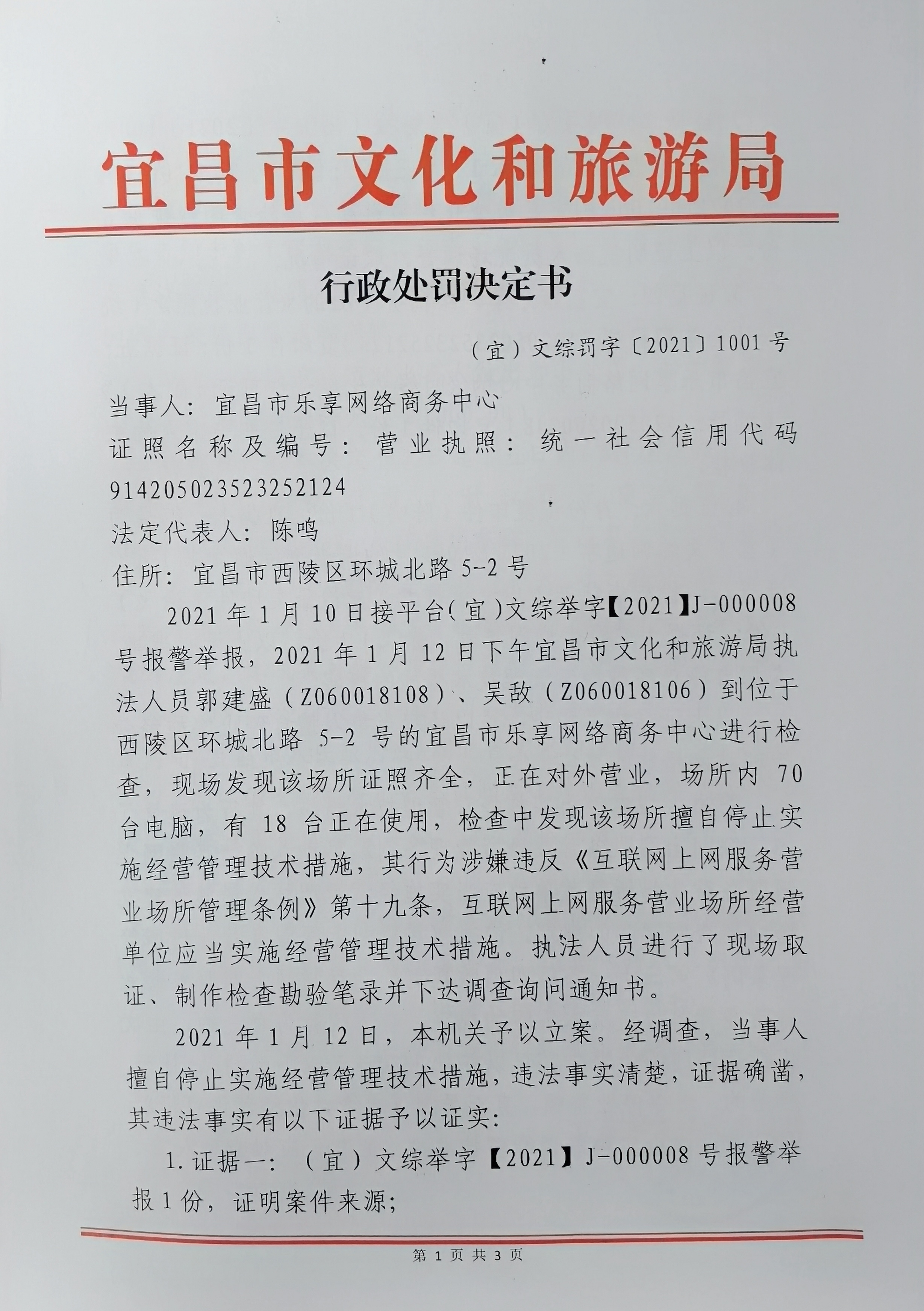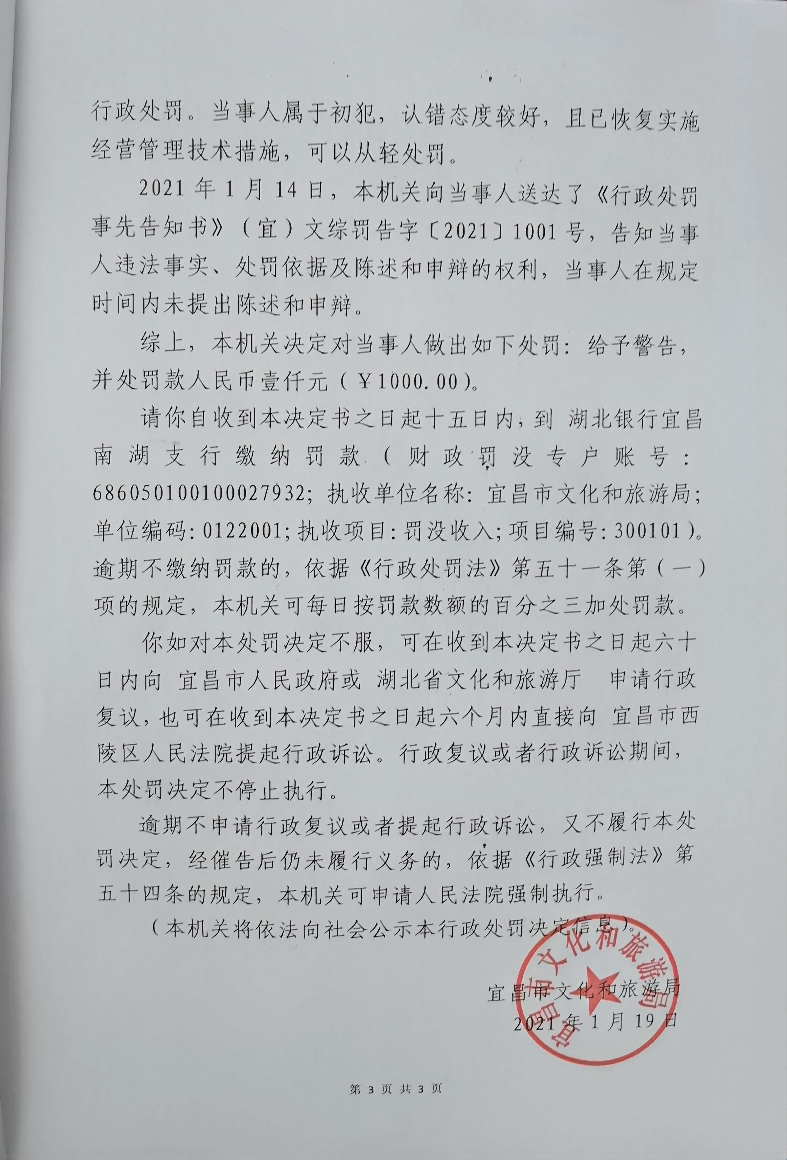 宜昌市文化和旅游局行政处罚决定书((宜)文综罚字〔2021〕1001号)