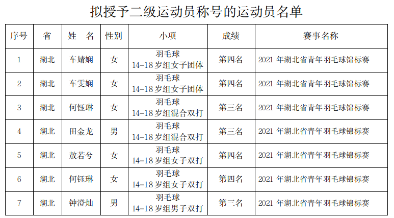 根据《运动员技术等级管理办法》的规定,经审核,现拟授予车婧娴等7人二级运动员称号。现按要求公示,公示期为2021年11月12日至2021年11月22日,公示名单见附件。