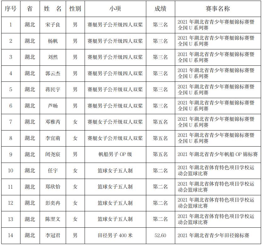 根据《运动员技术等级管理办法》的规定,经审核,现拟授予宋子良等14人二级运动员称号。现按要求公示,公示期为2022年1月21日至2022年1月29日,公示名单见附件。