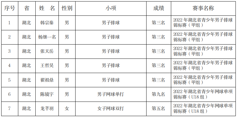 根据《运动员技术等级管理办法》的规定,经审核,现拟授予韩宗秦等7人二级运动员称号。现按要求公示,公示期为2023年2月1日至2023年2月9日,公示名单见附件。