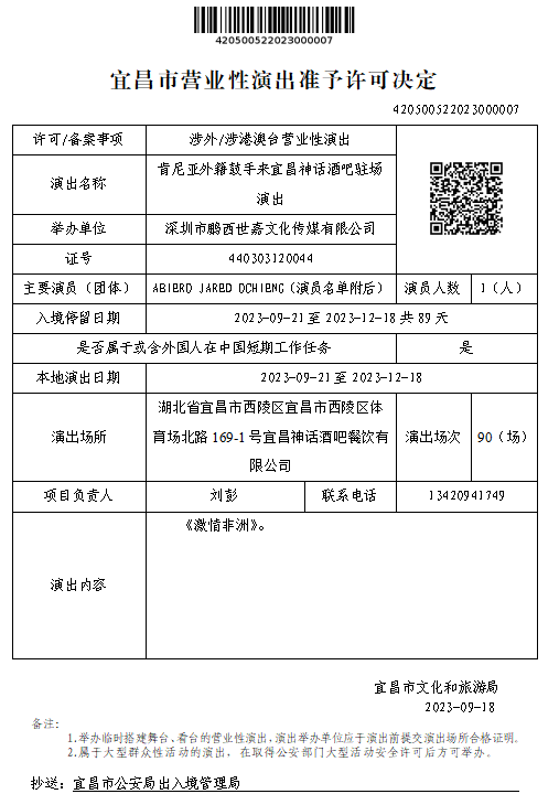 宜昌市营业性演出准予许可决定