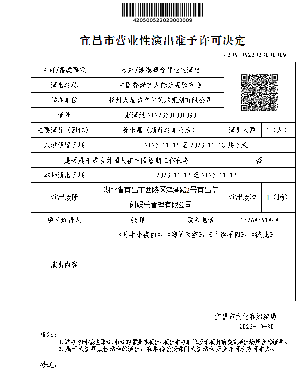 宜昌市营业性演出准予许可决定