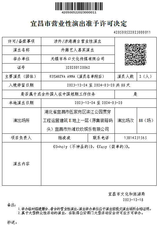 宜昌市营业性演出准予许可决定