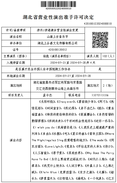 湖北省营业性演出准予许可决定