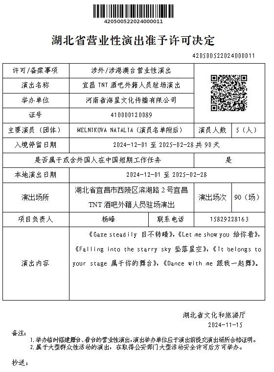| 1 | 俄罗斯 | MELNIKOVA NATALIA | 女 | 1993-09-29 | 舞蹈演员 | 护照 | 76*****58 | 2022-07-21至2032-07-21 |