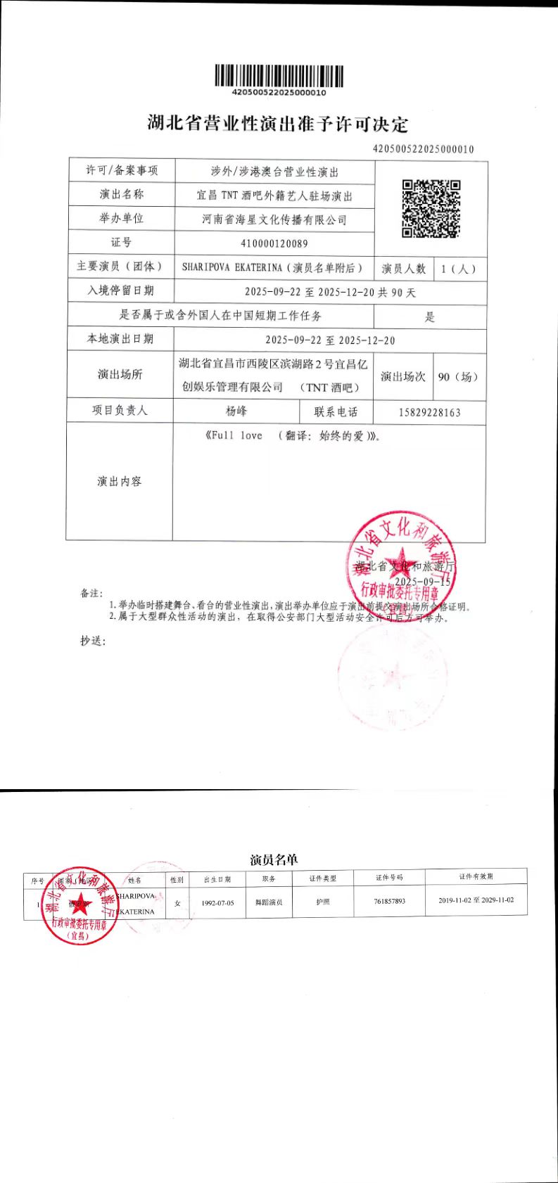 湖北省营业性演出准予许可决定(420500522025000010)