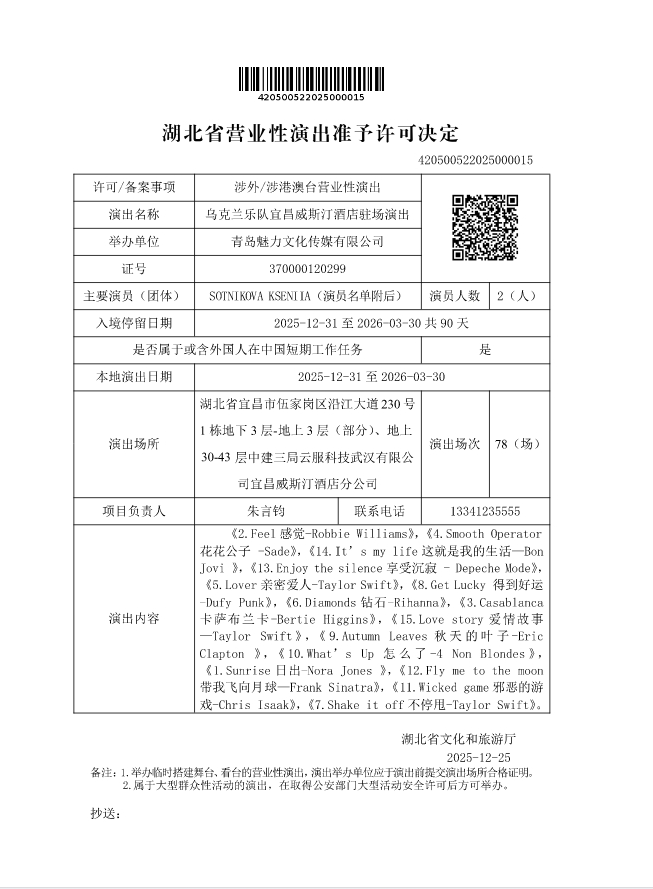 湖北省营业性演出准予许可决定 (420500522025000015)